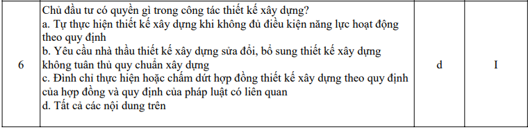 Đúng như anh Vũ Tiến Dũng phản hồi trong nhóm zalo, câu này xuất hiện 44 lần trong QĐ 163 tất cả đều có đáp án c trừ một lần duy nhất có đáp án d tại phần câu hỏi Pháp luật chung – Thiết kế xây dựng công trình – Kết cấu công trình – Hạng I